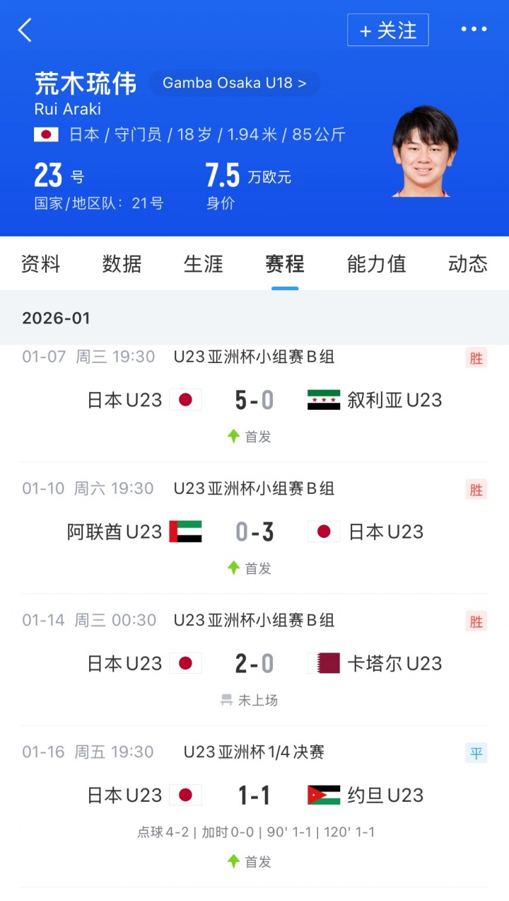 荒木琉伟现年18岁,身高1米94,效力于大阪钢巴青年队,跳级入选日本U20,曾随队参加U20亚洲杯。今年荒木琉伟入选日本U23名单,是本届U23亚洲杯日本队的首发门将。