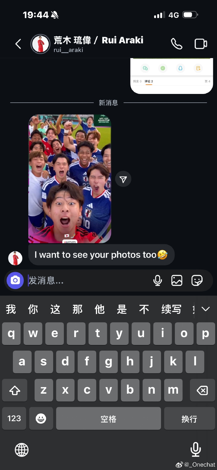 微博账号为“_Onechat”的网友爆料,称自己在INS遭遇日本U23门将荒木琉伟性骚扰,遭要性感照片+想发生性关系。