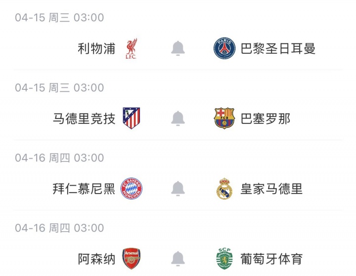 4月9日讯 欧冠1/4决赛首回合结束,巴萨0-2不敌马竞,巴黎2-0利物浦,拜仁2-1皇马,阿森纳1-0葡萄牙体育。次回合将于4月15/16日进行,利物浦、马竞、拜仁和阿森纳主场作战。你觉得谁能晋级四强?欧冠1/4决赛次回合赛程: