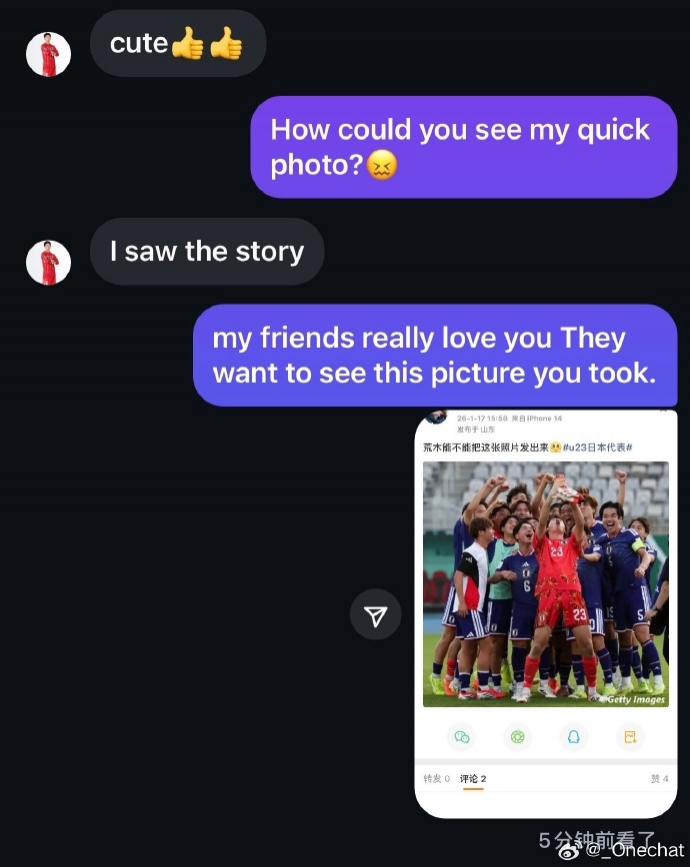 微博账号为“_Onechat”的网友爆料,称自己在INS遭遇日本U23门将荒木琉伟性骚扰,遭要性感照片+想发生性关系。