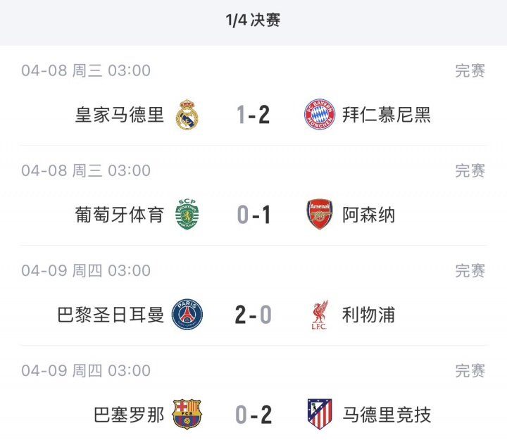 4月9日讯 欧冠1/4决赛首回合结束,巴萨0-2不敌马竞,巴黎2-0利物浦,拜仁2-1皇马,阿森纳1-0葡萄牙体育。次回合将于4月15/16日进行,利物浦、马竞、拜仁和阿森纳主场作战。你觉得谁能晋级四强?欧冠1/4决赛次回合赛程: